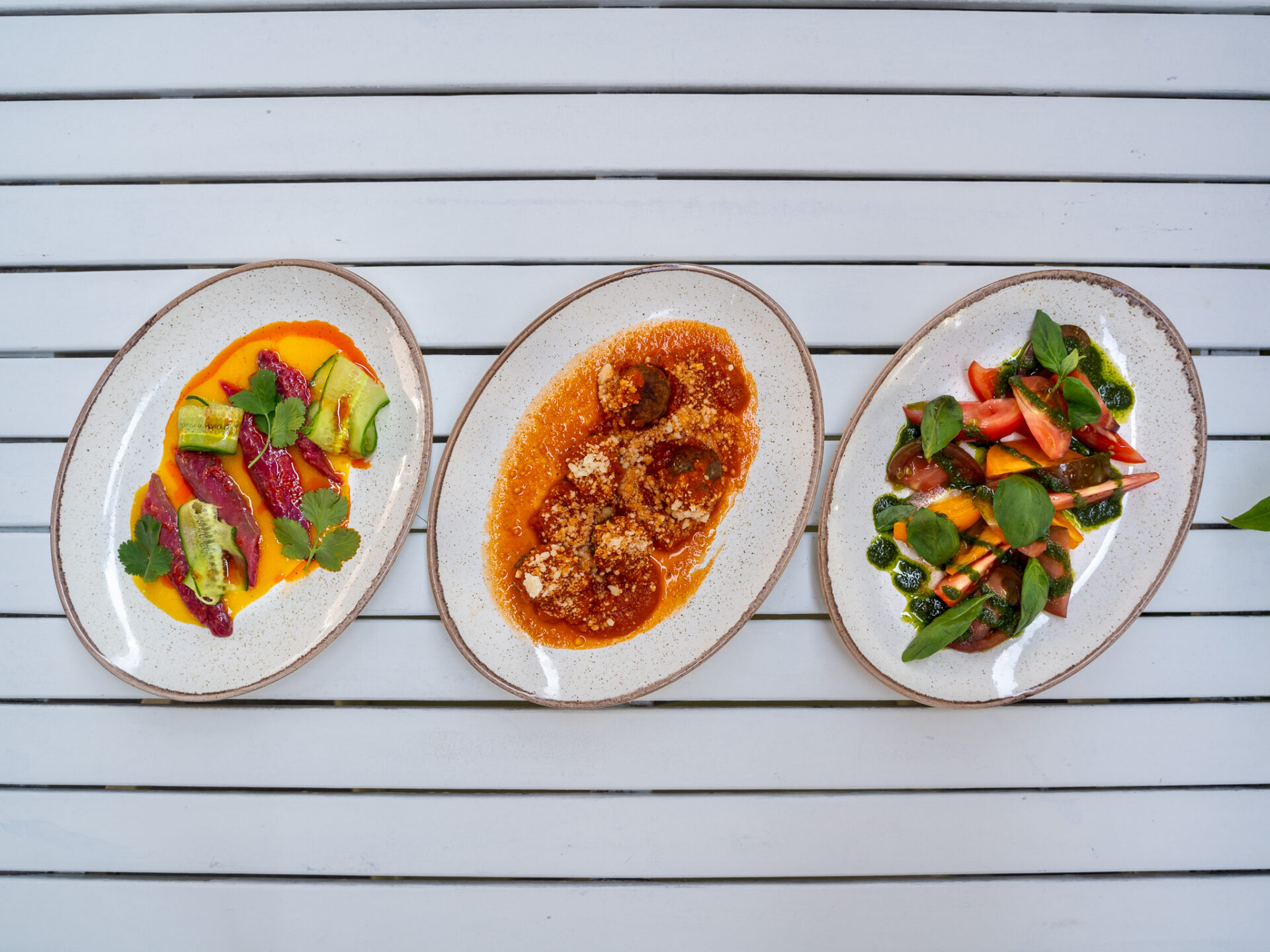 - Fattoush salade (VGN - g) Goudbruin gebakken aubergine, knapperig flatbread, romaine sla, groene radijs, gedroogde kerstomaten, zwarte olijven, sumac vinaigrette € 15.5 + Vegan kaas +2